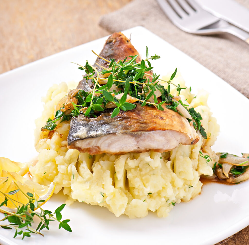 Com uma escumadeira (ou pinça), retire as postas de bacalhau da água e transfira para um refratário. Mantenha a panela com a água no fogo e coloque batatas. Deixe cozinhar por cerca de 10 minutos, elas devem estar cozidas mas ainda firmes – espete com um garfo para verificar
